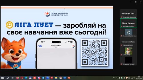 22.01.2026 року завідувачка кафедри економічної кібернетики, бізнес-економіки та інформаційних систем Кононенко Жанна Андріївна взяла участь в онлайн зустрічі з майбутніми потенційними абітурієнтами, де розглядались переваги вступу та навчання в Полтавському університеті економіки і торгівлі (#ПУЕТ), зокрема на освітній програмі "Економіка".