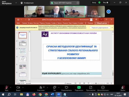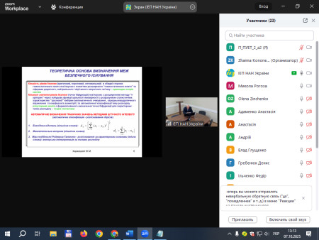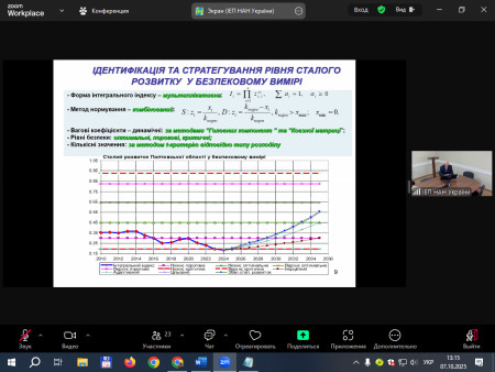 Новікова Ольга Федорівна (заступник директора з наукової роботи Інституту економіки промисловості НАН України, д.е.н., проф., зав. відділом економічних проблем соціальної політики Інституту економіки промисловості НАН України), яка підкреслила важливість отриманих результатів дослідження та методологію прогнозування соціально- економічного розвитку, особливо було підкреслено можливість та перспективність використання технологій штучного інтелекту, як інструменту вирішення задач такого типу. Було також підкреслено складність проблеми ідентифікації та стратегування сталого регіонального розвитку у безпековому вимірі, актуальність таких задач дослідження та оригінальність їх вирішення за пропонованою методологія використання економіко -математичних моделей та інструментів програмного забезпечення.