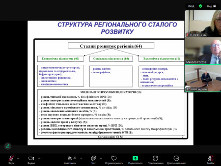 Рогоза Микола Єгорович, д.е.н., професор кафедри економічної кібернетики бізнес економіки та інформаційних систем, який підкреслив важливе значення для здобувачів вищої освіти розуміння регіонального розвитку, знань досвіду використання інструментів прогнозування та моделювання соціально-економічних процесів, що є важливо у формуванні їх компетенцій як фахівців зі спеціальності економіка. Також було підкреслено, що результатом співпраці науково-педагогічних працівників ПУЕТ та науковців ІЕП НАНУ стали розроблені науково-аналітичні доповіді, в яких представлено результати досліджень проблемних складових сталого розвитку Полтавської області та пріоритетні складові інституційних заходів (д.е.н.Ляшенко В.І., д.е.н.Харазішвілі Ю.М) та ПУЕТ (д.е.н.Рогоза М.Є., д.е.н. Перебийніс В.І): «Стратегічні сценарії відновлення сталого розвитку полтавської області та інституційні умови їхнього досягнення (д.е.н. Харазішвілі Ю.М., д.е.н. Рогоза М.Є., 2022 р.); «Оцінювання потенціалу регіональних інноваційних екосистем для забезпечення повоєнного відновлення та структурної трансформації економіки промислових регіонів україни на засадах смарт-спеціалізації» (С. І. Князєв, д.е.н. В. І. Ляшенко, д.е.н. І. Ю. Підоричева, д.е.н. Г.З. Шевцова, д.е.н. В. А. Омельяненко, д.е.н. М. Є. Рогоза, к.е.н. Н. В. Швець, к.е.н. А. І. Землянкін, аспіранти А.С. Баш, Ю. А. Кравченко, О. В. Ліщук., 2023 р.); «Визначення траєкторій та можливих сценаріїв повоєнної реконструкції Полтавської області на засадах сталого розвитку»(д.е.н. Харазішвілі Ю.М., д.е.н. Ляшенко В.І. , д.е.н. Рогоза М.Є., 2025 р.).