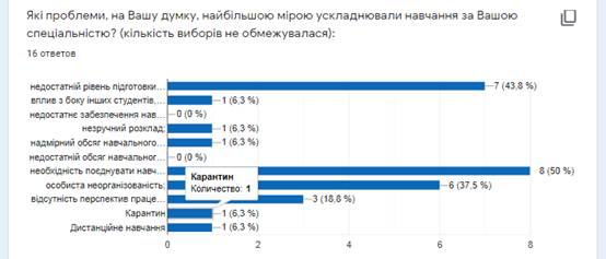 Студентам було запропоновано відповісти на питання, що стосувалися задоволеності вибором освітньої програми та її наповненості, відвідуваності навчальних занять, академічної доброчесності, навчального навантаження та практики, поєднання навчання з роботою тощо.
