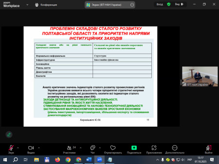Рогоза Микола Єгорович, д.е.н., професор кафедри економічної кібернетики бізнес економіки та інформаційних систем, який підкреслив важливе значення для здобувачів вищої освіти розуміння регіонального розвитку, знань досвіду використання інструментів прогнозування та моделювання соціально-економічних процесів, що є важливо у формуванні їх компетенцій як фахівців зі спеціальності економіка. Також було підкреслено, що результатом співпраці науково-педагогічних працівників ПУЕТ та науковців ІЕП НАНУ стали розроблені науково-аналітичні доповіді, в яких представлено результати досліджень проблемних складових сталого розвитку Полтавської області та пріоритетні складові інституційних заходів (д.е.н.Ляшенко В.І., д.е.н.Харазішвілі Ю.М) та ПУЕТ (д.е.н.Рогоза М.Є., д.е.н. Перебийніс В.І): «Стратегічні сценарії відновлення сталого розвитку полтавської області та інституційні умови їхнього досягнення (д.е.н. Харазішвілі Ю.М., д.е.н. Рогоза М.Є., 2022 р.); «Оцінювання потенціалу регіональних інноваційних екосистем для забезпечення повоєнного відновлення та структурної трансформації економіки промислових регіонів україни на засадах смарт-спеціалізації» (С. І. Князєв, д.е.н. В. І. Ляшенко, д.е.н. І. Ю. Підоричева, д.е.н. Г.З. Шевцова, д.е.н. В. А. Омельяненко, д.е.н. М. Є. Рогоза, к.е.н. Н. В. Швець, к.е.н. А. І. Землянкін, аспіранти А.С. Баш, Ю. А. Кравченко, О. В. Ліщук., 2023 р.); «Визначення траєкторій та можливих сценаріїв повоєнної реконструкції Полтавської області на засадах сталого розвитку»(д.е.н. Харазішвілі Ю.М., д.е.н. Ляшенко В.І. , д.е.н. Рогоза М.Є., 2025 р.).